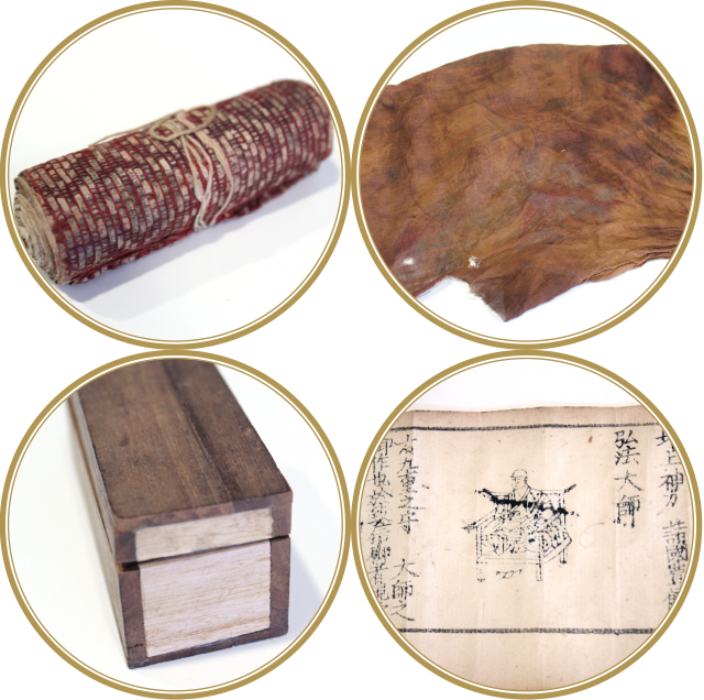 そして後日、本家から連絡があり、夢の通り仏壇の引き出しにあったというので再び両親と本家へ。それがこの写真。夢の中で白い布は椿柄。発見された布は茶色だったが、仏壇でお線香の煙を吸ったからだと想像がつく。布を良く見ると模様には椿の絵柄があるからだ。この巻物の最後に「大師二世」と書かれている。私の父方の形見だった。今この布を引き取って私の手元にある。
